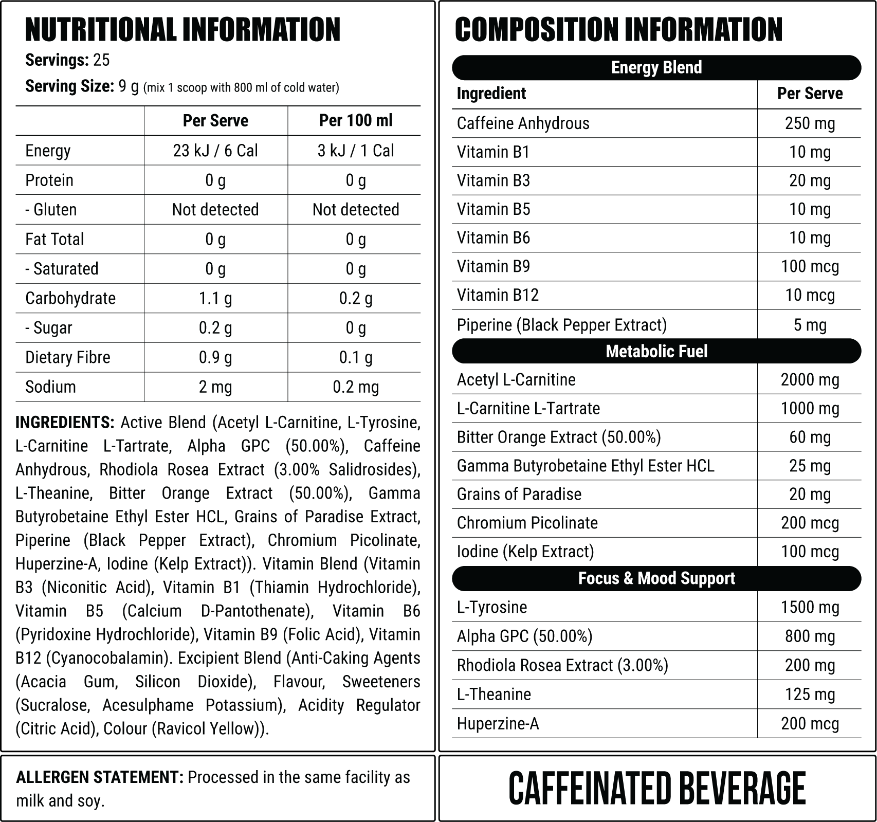 L‑Tyrosine 1,500 mg, Alpha‑GPC (50%) 800 mg, L‑Theanine 125 mg, Huperzine‑A 200 mcg and Rhodiola Rosea Extract 200 mg.