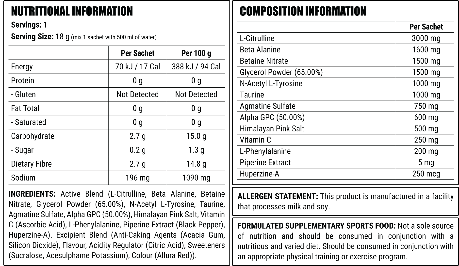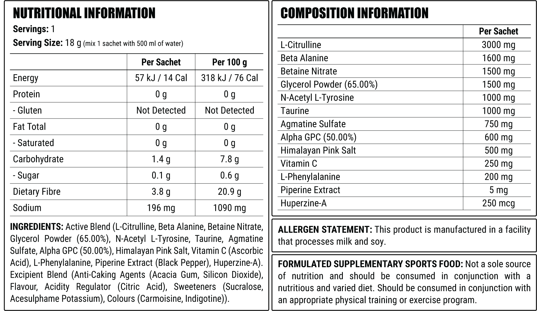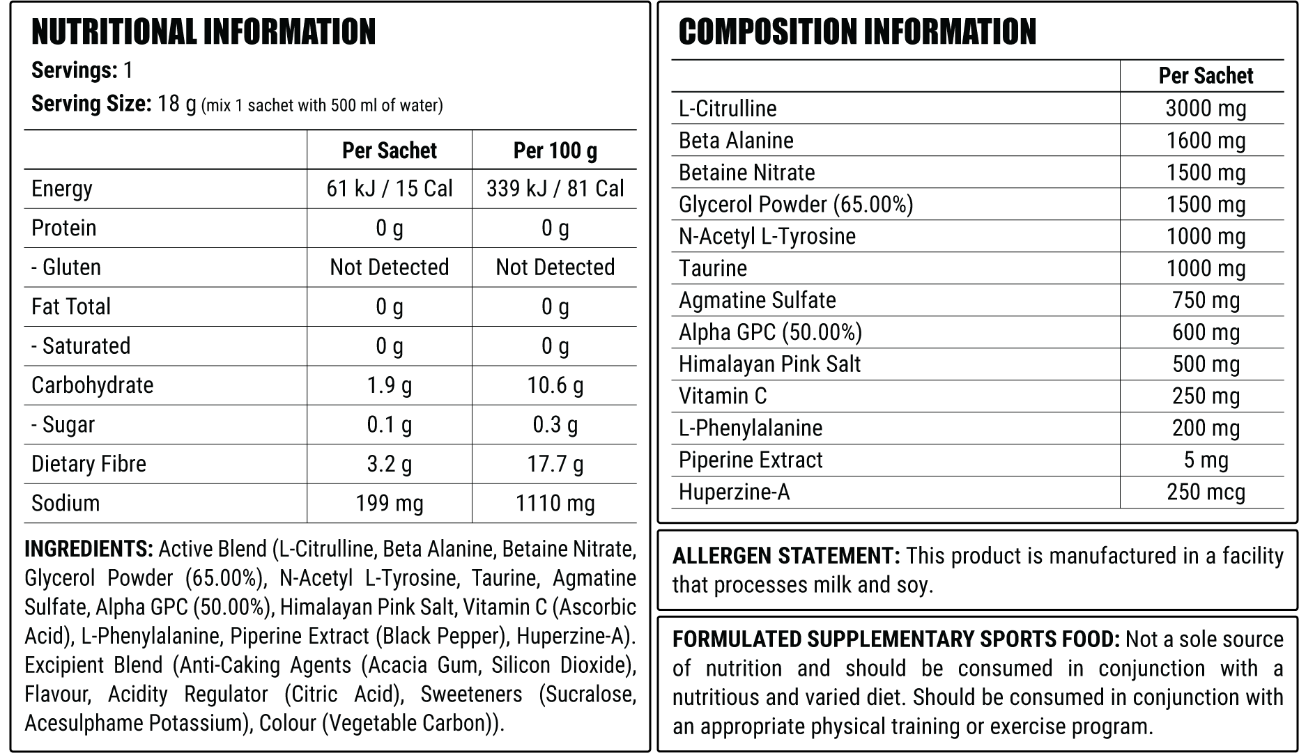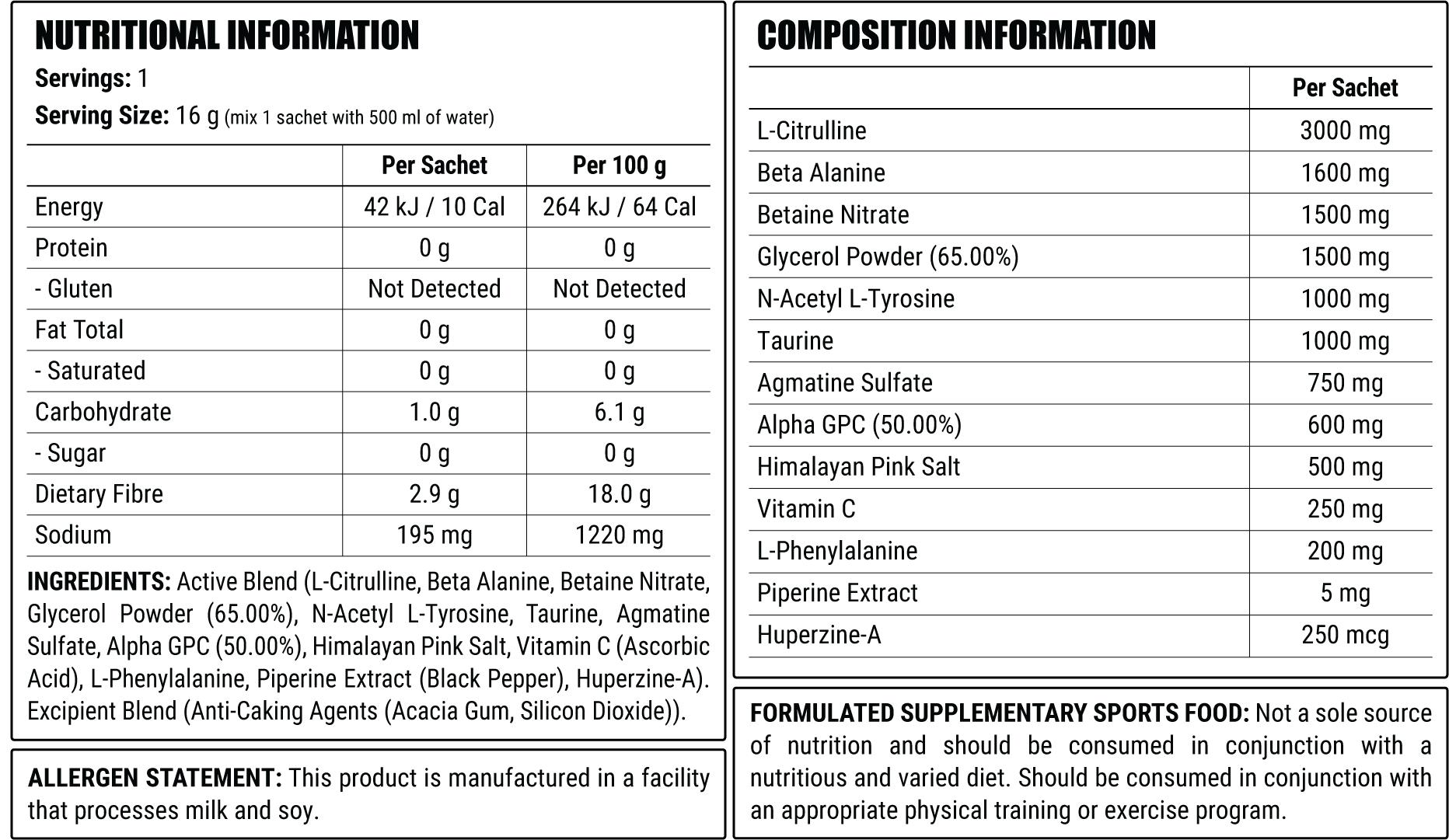 Enhances blood flow, vascularity and muscle fullness while boosting endurance, hydration and mental focus, all without the crash.