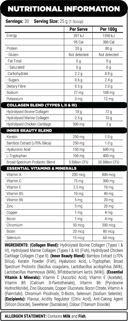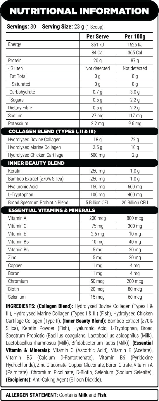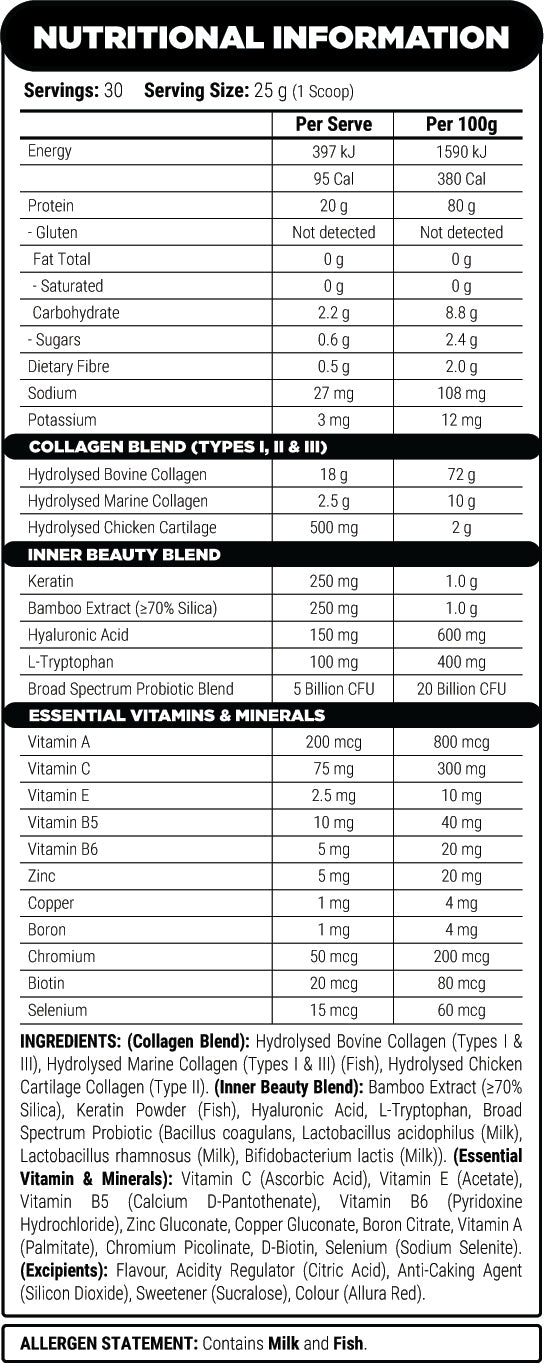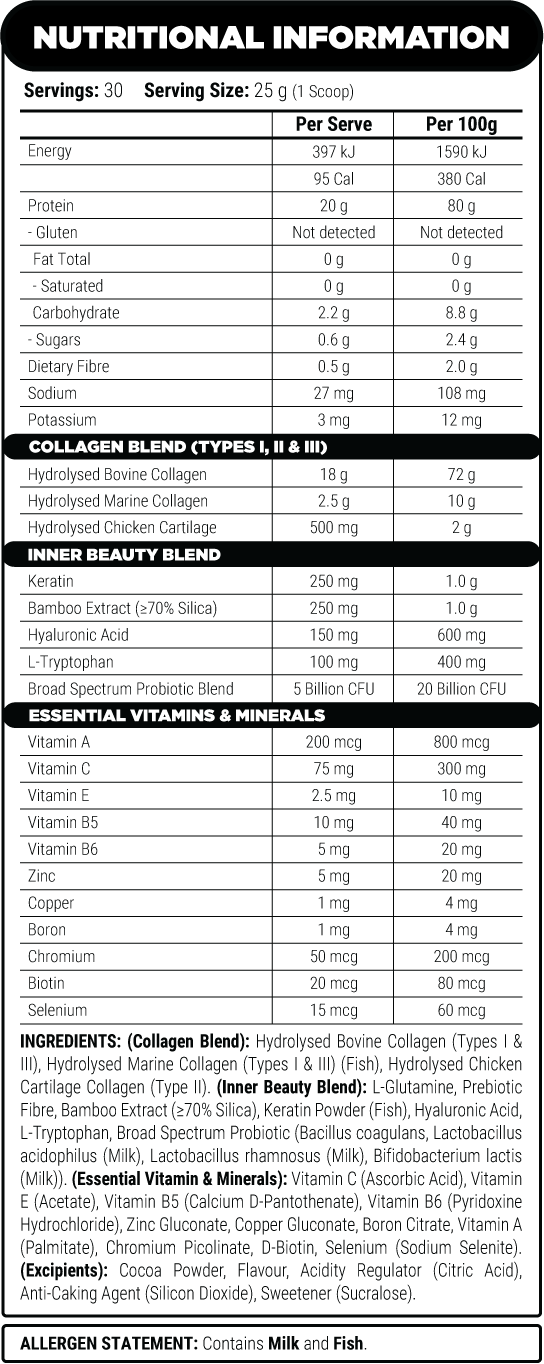 Provides 20 g of protein per serve fromhydrolysed collagen sources, including bovine, marine and poultry-derivedcollagen (Types I, II & III).
